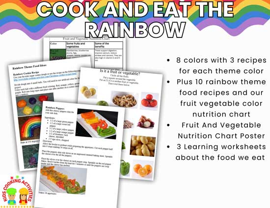 Cooking with the Rainbow This Cooking the Rainbow Theme Cooking Unit includes 8 colors with 3 recipes for each theme color. Plus 10 rainbow theme food recipes and our fruit vegetable color nutrition chart. See more details on our See you next week!Have you been printing off these recipe cards and using them? Feel free to hit reply and let me know if they have helped!Want to catch up on past recipe cards? Back Issues for Kids Cooking Activities Club Have a recipe to share? Send me your ideas or just reply to this email. Have a great time cooking!