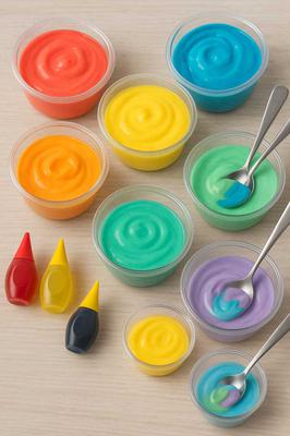 Ingredients: Vanilla yogurt or pudding (divided into small cups) Primary food coloring (red, yellow, blue) Spoons or droppers