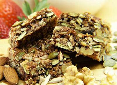 Combine all ingredients and pat firmly into a greased 8×8 pan (or roll into balls). Chill.