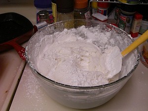 Add 8 cups or 2 lbs powdered sugar to a large mixing bowl. Pour