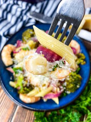 9. Remove from oven and pour the roasted shrimp and vegetables into the pot with the cooked pasta. Add the remaining lemon juice, lemon zest, half the Parmesan cheese, fresh parsley, and the reserved cooking liquid. Season with additional salt and black pepper, if desired, and toss to combine.